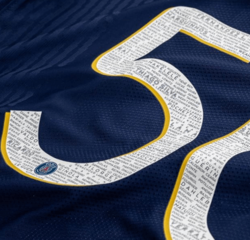 Sur le bas du maillot, une cartouche argentée avec un numéro attribué de 1 à 985. Le numéro 50 sera floqué. Et ces maillots compoteront le nom des 467 joueurs qui ont porté la maillot du PSG. Pour le prix : 240 euros.